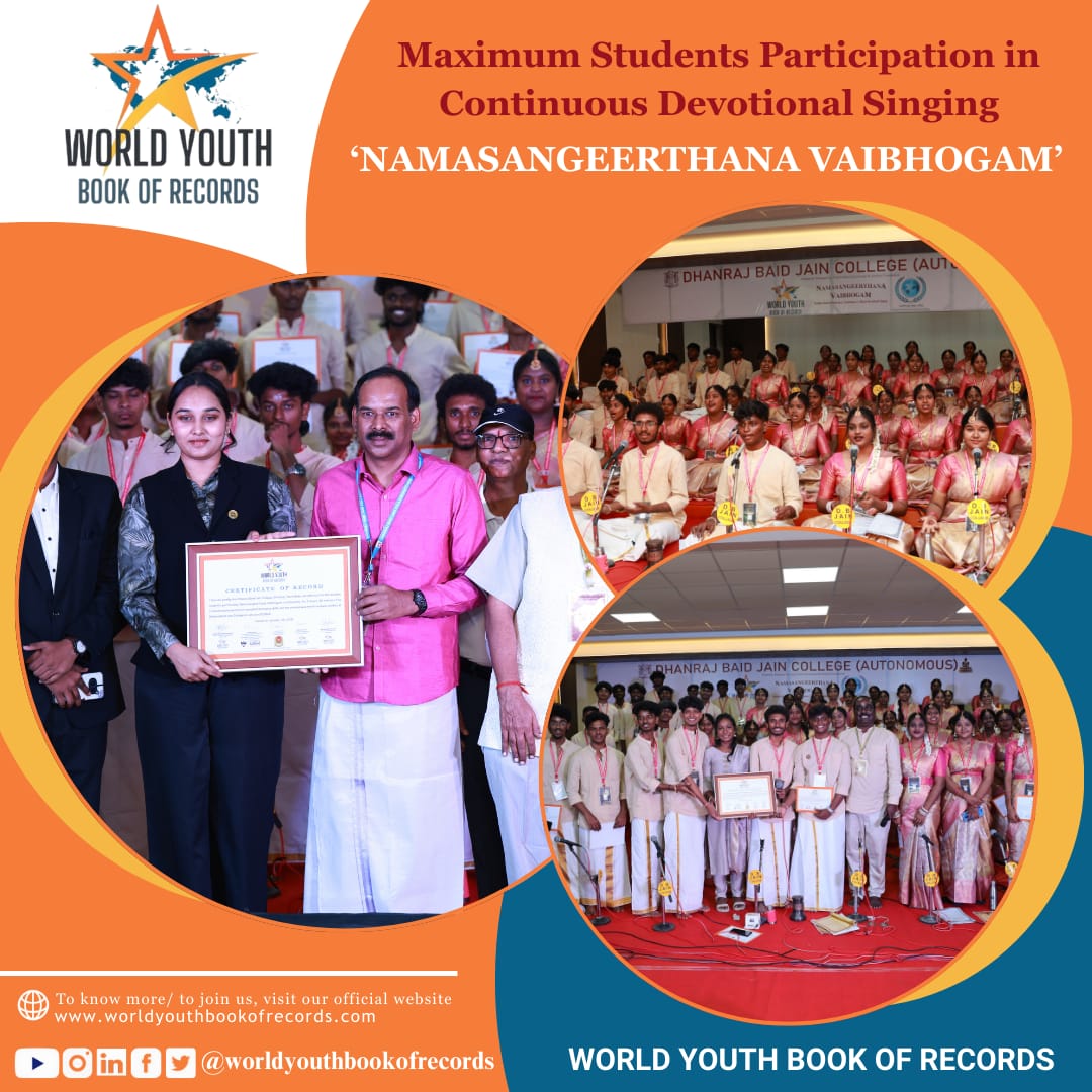Dhanraj Baid Jain College (Autonomous), Thuraipakkam, Chennai, recently marked a remarkable cultural and spiritual milestone by successfully organizing Namasangeerthana Vaibhogam, a continuous devotional music performance that earned official recognition as a World Record by the World Youth Book of Records. This historic accomplishment highlights the institution’s commitment to cultural preservation, spiritual enrichment, and holistic student development.